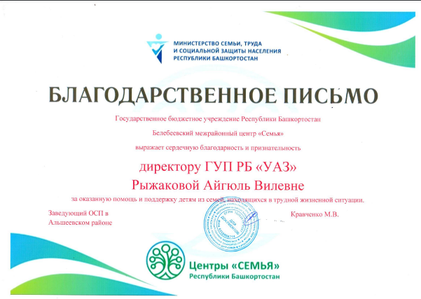 Сотрудники ГУП РБ «Управление административными зданиями» во главе с руководителем Рыжаковой Айгюль Вилевной посетили ГБУ Республики Башкортостан Белебеевский межрайонный центр «Семья», с целью оказания благотворительной помощи и поддержки детям из семей, находящихся в трудной жизненной ситуации.